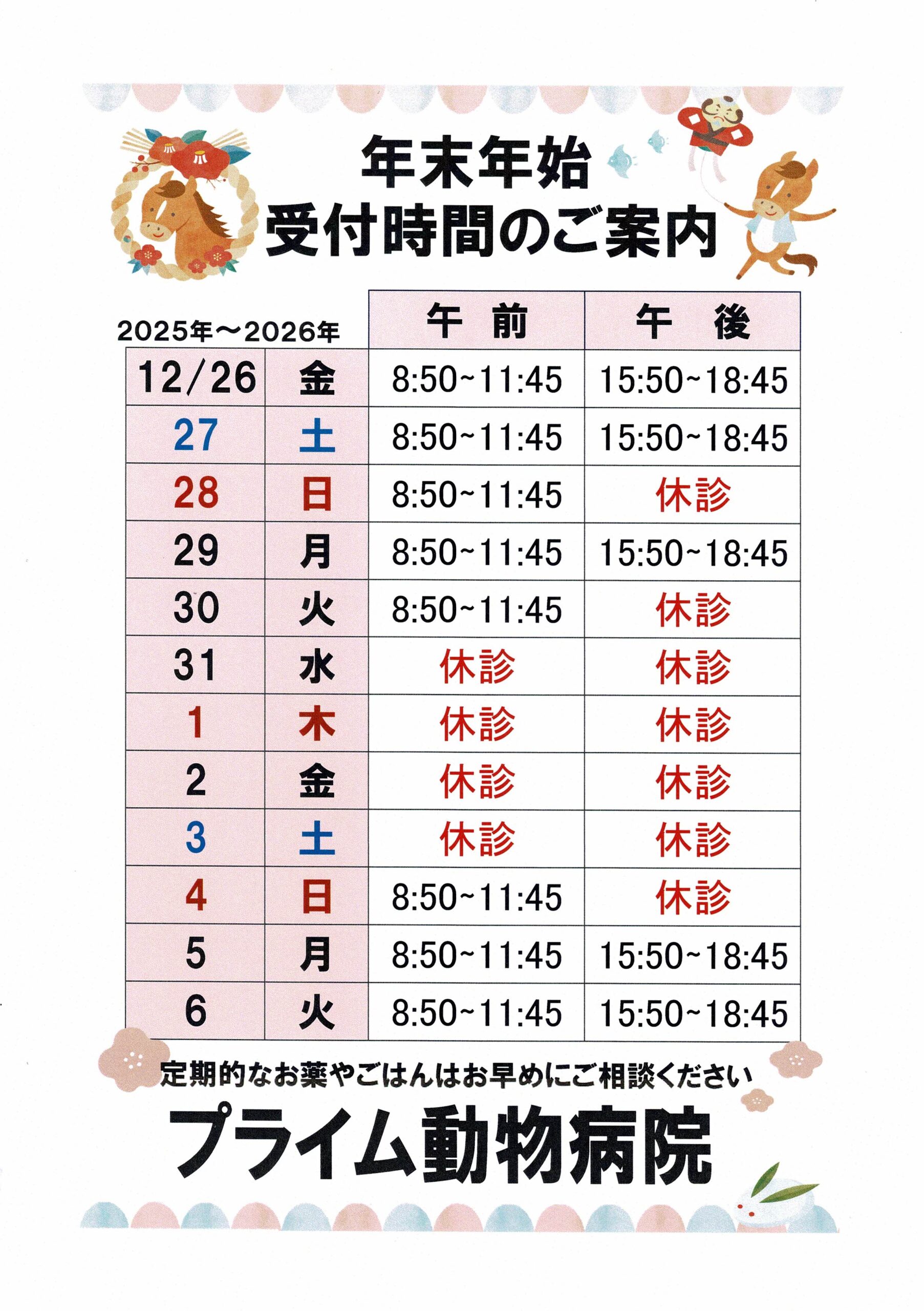 2025.12.17お知らせ 年末年始の診療・休診について 12月30日の午後から1月3日まで休診になります。 ご迷惑をお掛けいたしますが、何卒ご理解のほどよろしくお願いいたします。 緊急の際は、休日診療当番病院に電話予約を取られてからの受診をお願いいたします。 鹿児島地区獣医師会当番医・夜間診療案内(要予約) Tel 099-258-5992 SHAREシェアする [addtoany] ブログ一覧